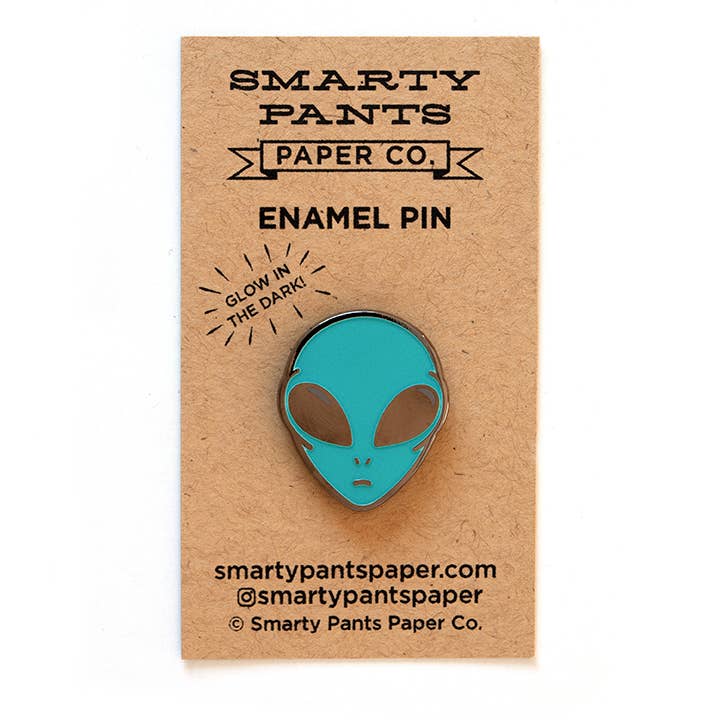 Alien head pin in seafoam green, glow in the dark enamel. Gunmetal/ black nickel colored metal backside. Light gray screen printed highlights on eyes