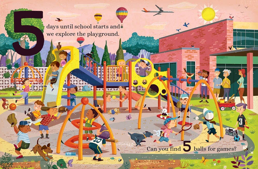 Toddlers learn to count down from 10 to 1 as they mark the days until school begins, and they can practice counting by finding objects hidden throughout these fun back-to-school scenes in Paprocki’s classically retro mid-century art style.