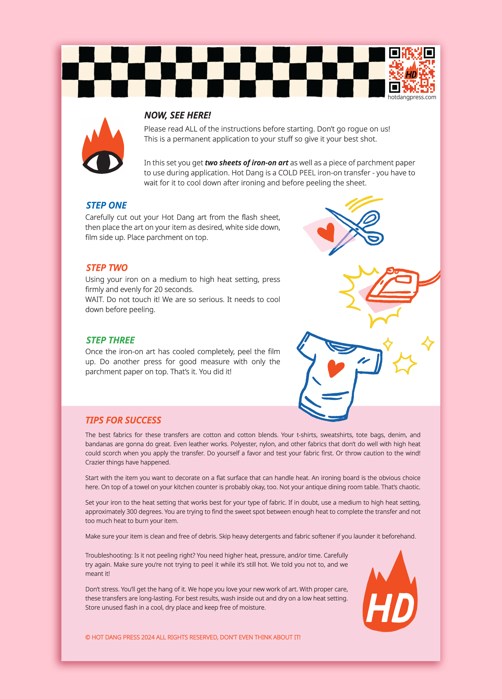 Iron-on art to customize and enhance your apparel, totes, hats, tea towels, bandanas, handkerchiefs, leather goods, and other treasures.