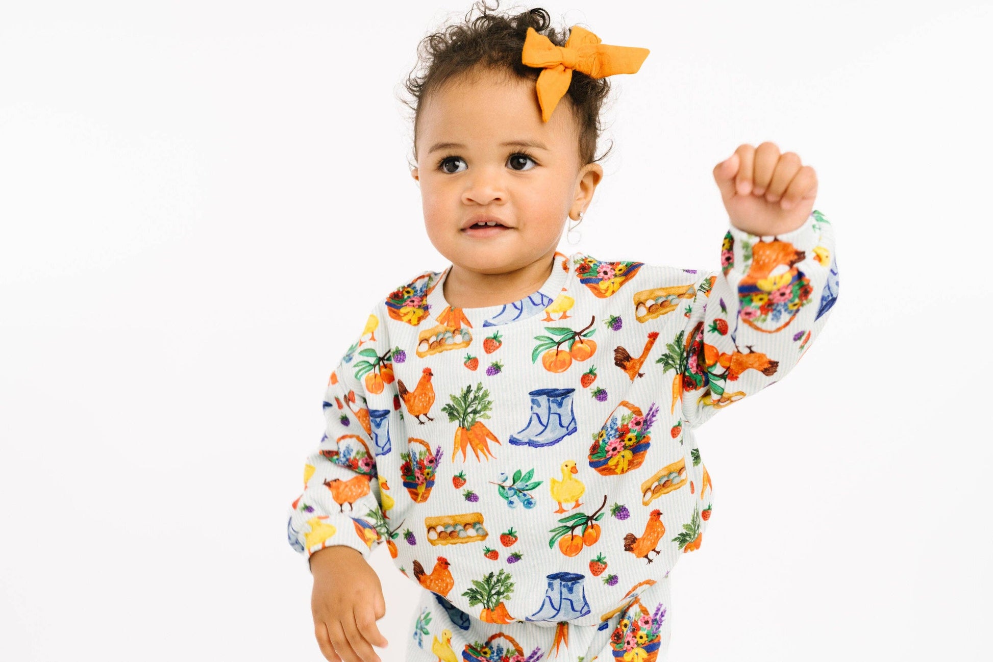This is the happiest harvest and cutest produce print on a lightweight, sweatsuit.