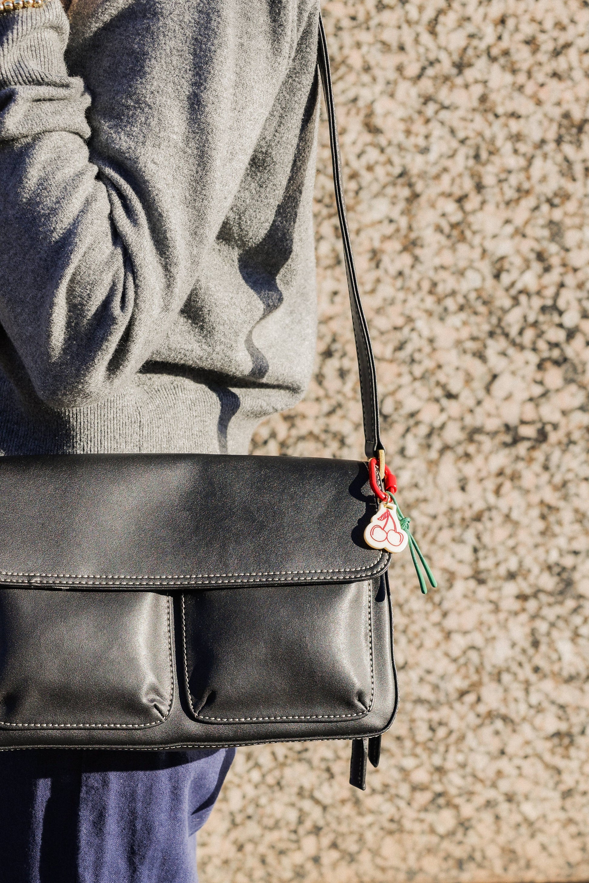 Featuring a mini red carabiner for easy attachment, a green cord tassel with soft silicone tips, and our handcrafted, cream and red acrylic cherries charm that captures the girly aesthetic, this keychain bag charm adds a bright, fun touch to any accessory.