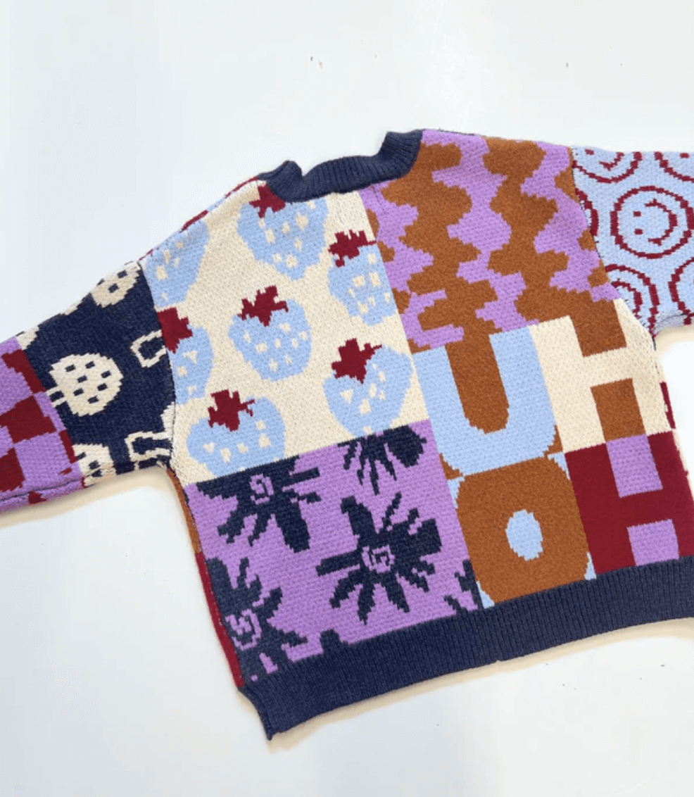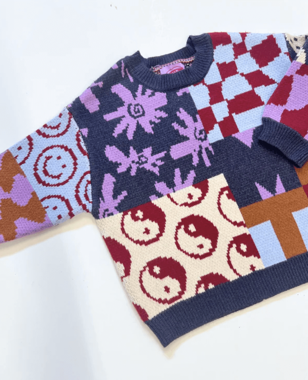 Meet the Everything Sweater by Milk Teeth. It's an oversized, boxy fit sweater in pleasing, un gendered colors and patterns. This sweater has everything: smiley faces, mushrooms, wavy checkers, flowers, strawberries and yin-yangs, all in our signature soft and stretchy knit.