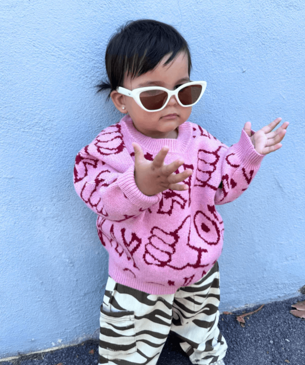 Meet the Okay Sweater from Milk Teeth. It's an oversized, un gendered, boxy fit sweater in bubble gum and maroon featuring an adorable, all over okay and thumbs up design.
