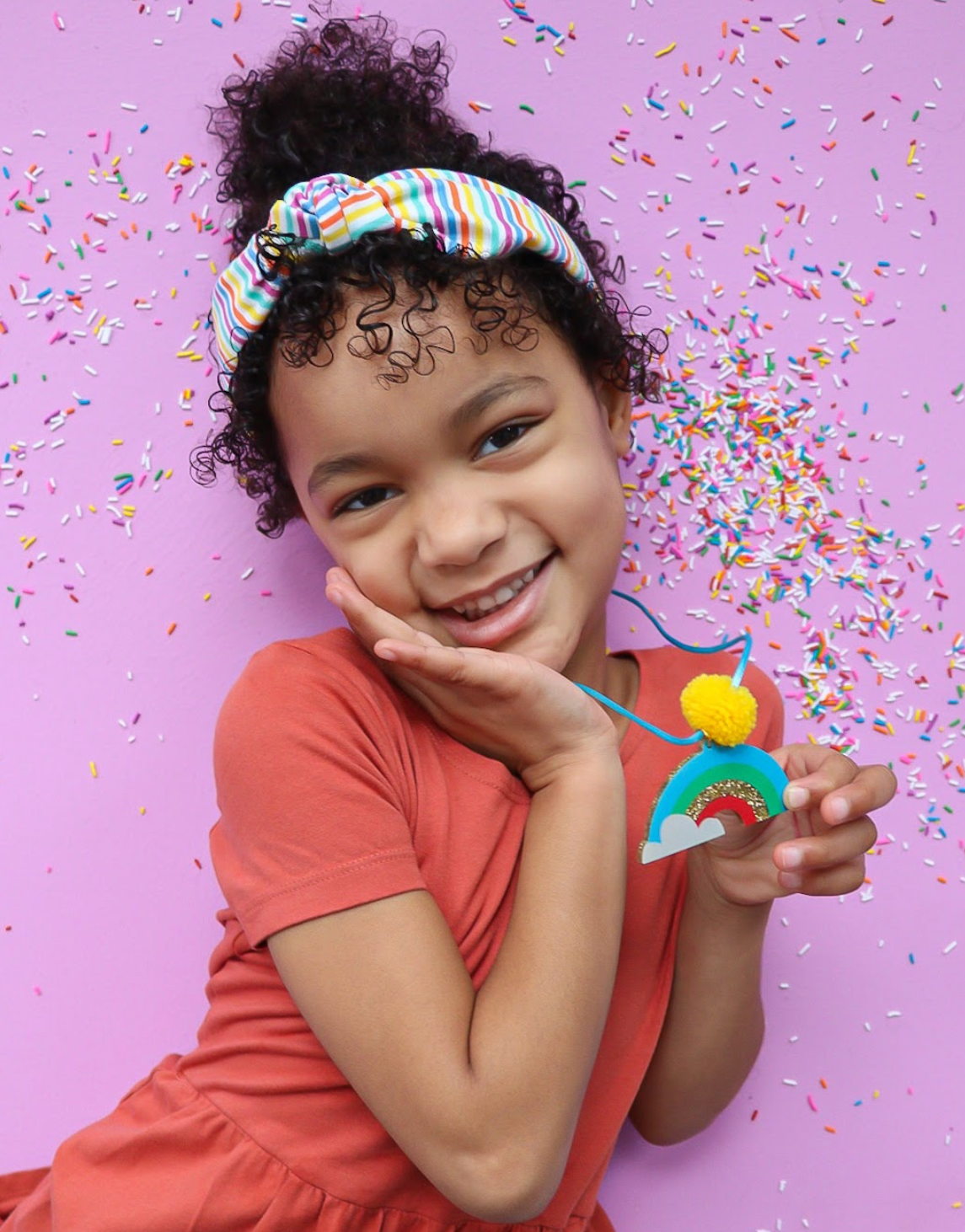 Not a cloud in sight with this Gold Glitter Rainbow Colors Necklace + Yellow POM POM