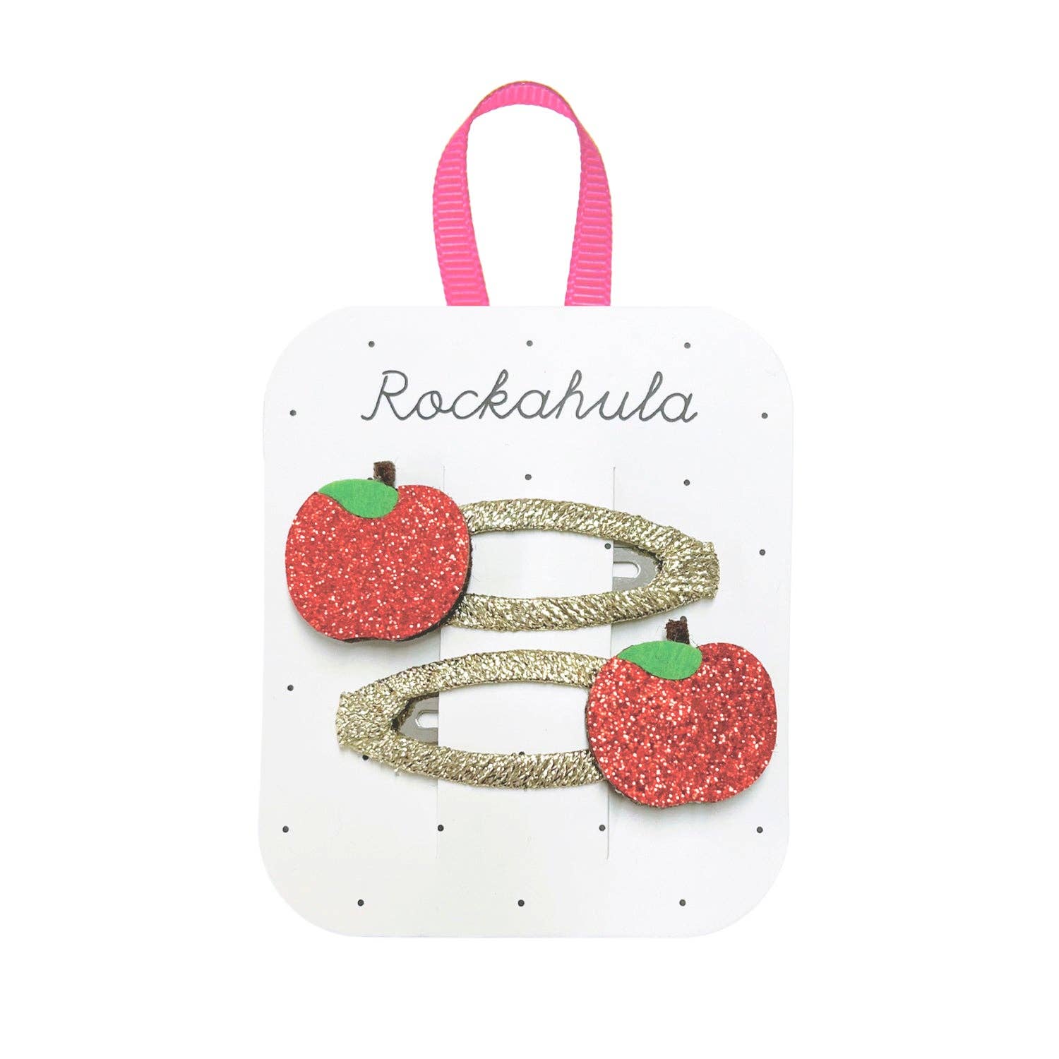 A pack of two rosy red glitter apples, set upon gold ribbon wrapped snap clips.