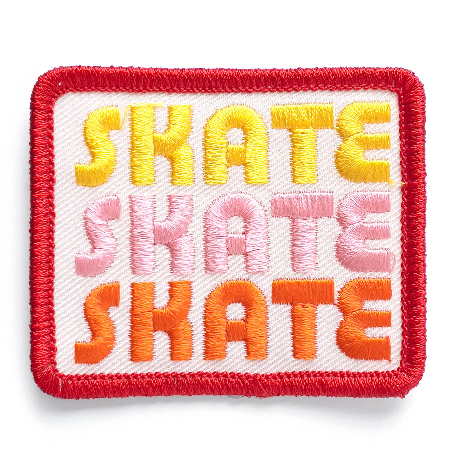 "Skate skate skate" embroidered in yellow, orange, and pink on off-white fabric with a red border.