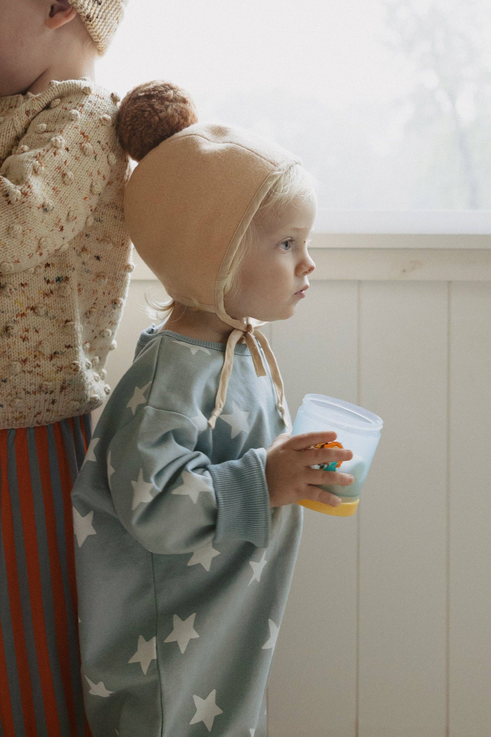 This dusty blue romper with white stars is designed in our signature oversized fit for maximum comfort and movement.