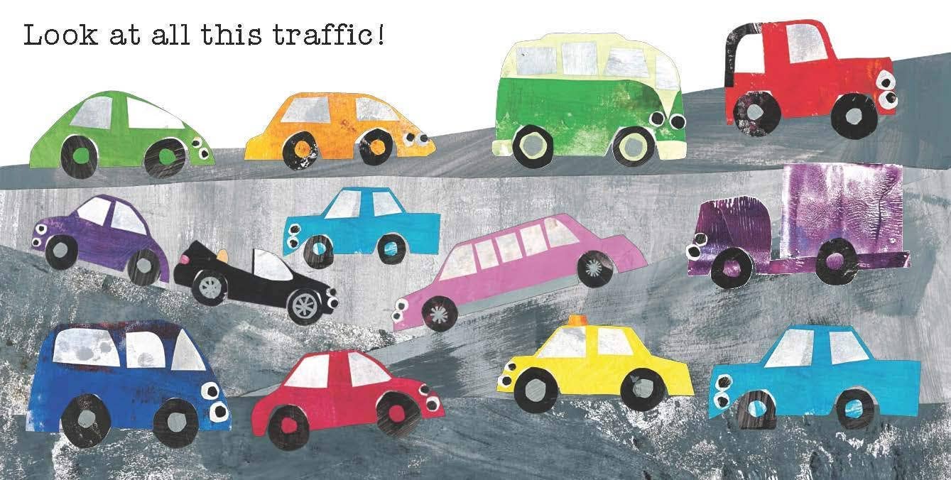Little ones will love joining in with the sounds, reading them aloud as they watch a little red jeep, big blue van, and big yellow taxi pass by.