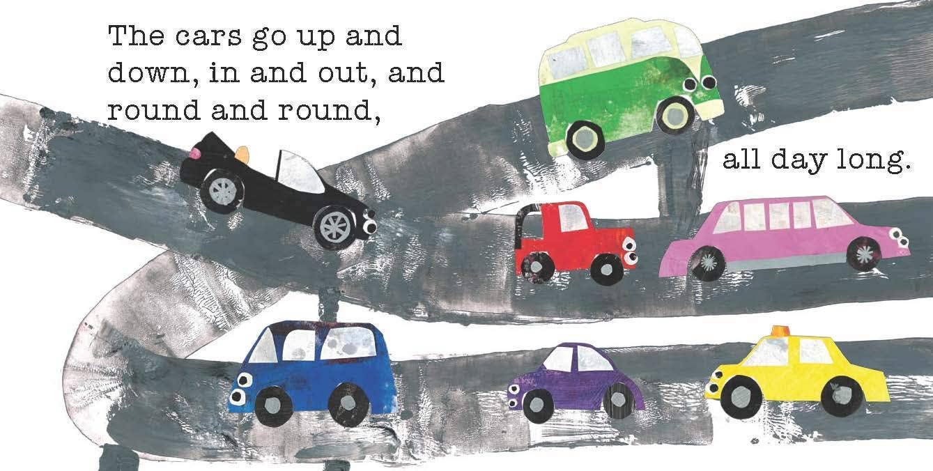 Colorful cars beep-beep, toot-toot, vroom-vroom, and whoosh across these collage-like pages, inviting kids along on an entertaining trip.