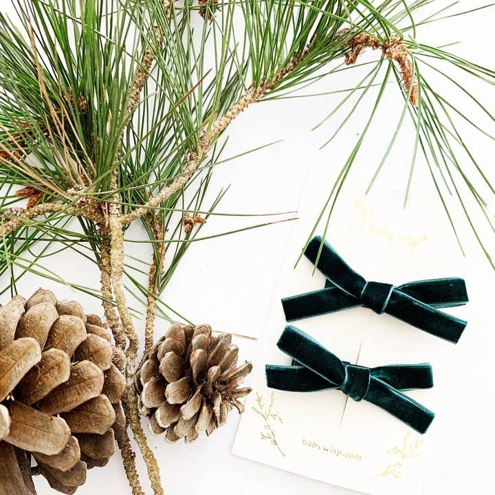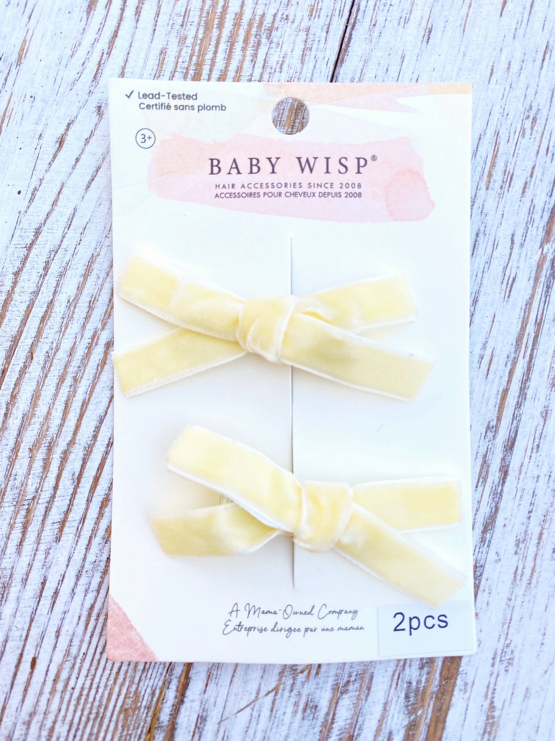 Perfect for pigtails or side sweep, this pair of 3/8" Velvet Hand-tied bows are attached to ribbon-covered 1.5" alligator clips.