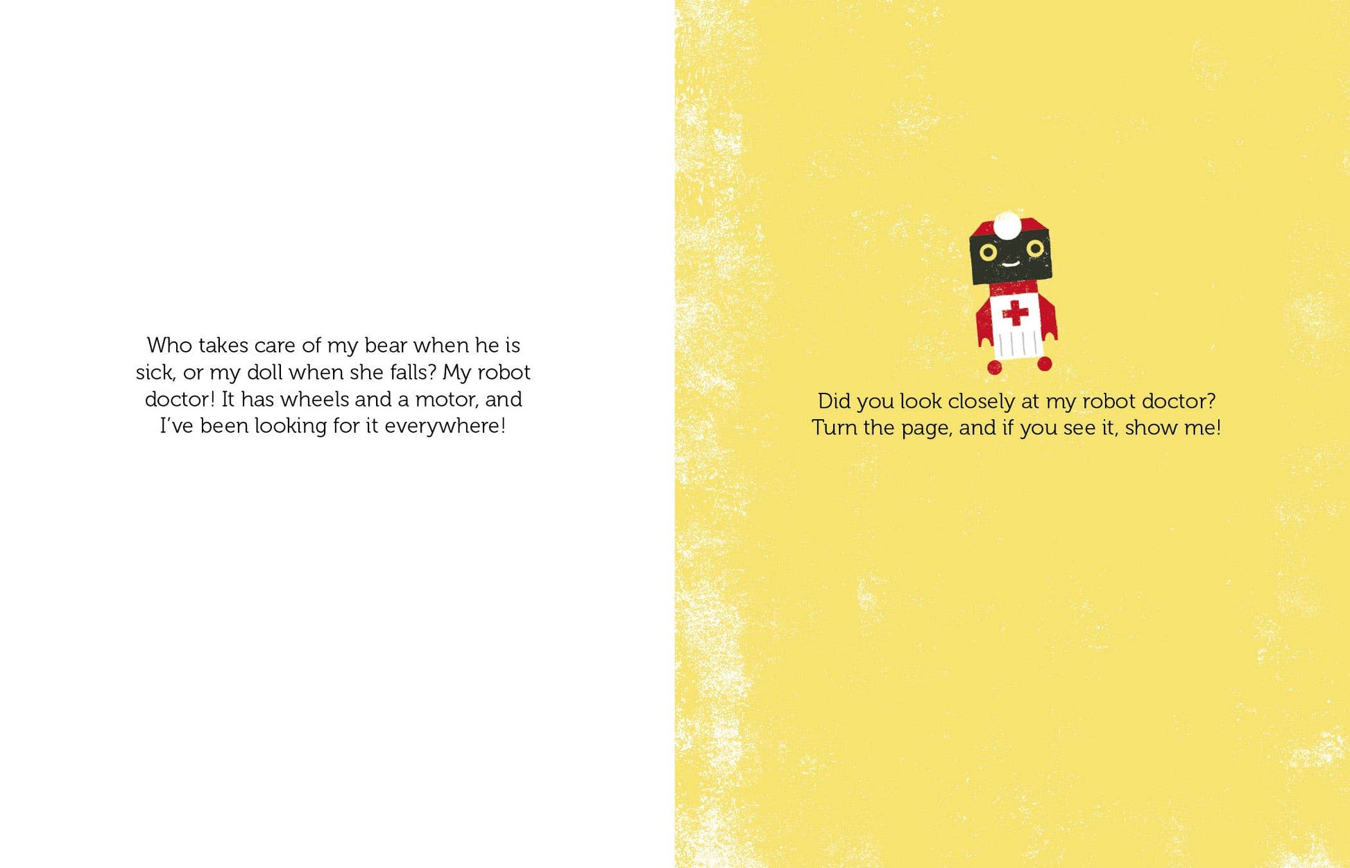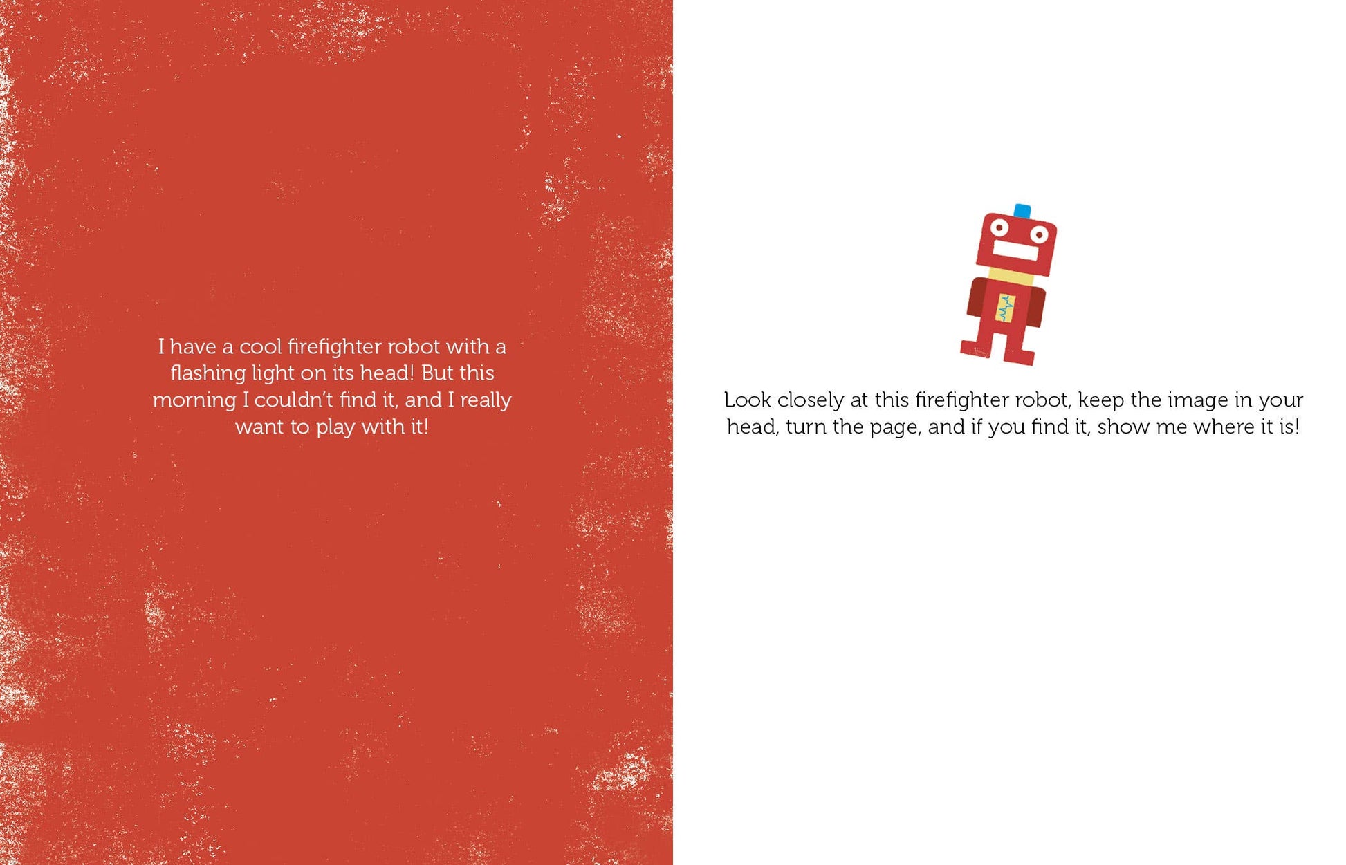 Playfully drawn collections of near-lookalike robot toys invite young children to explore shapes, colors, and details until they can put their finger on the exact robot shown on the previous page.