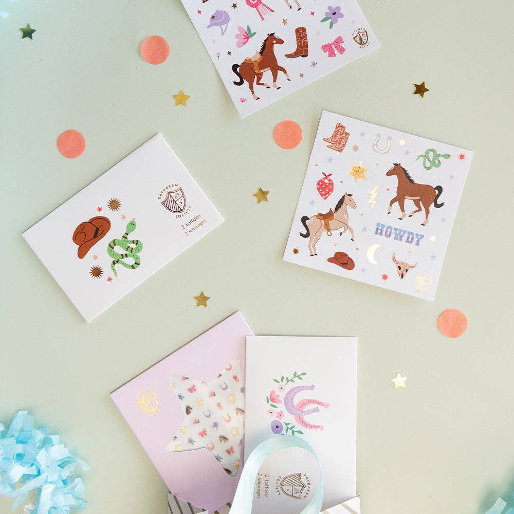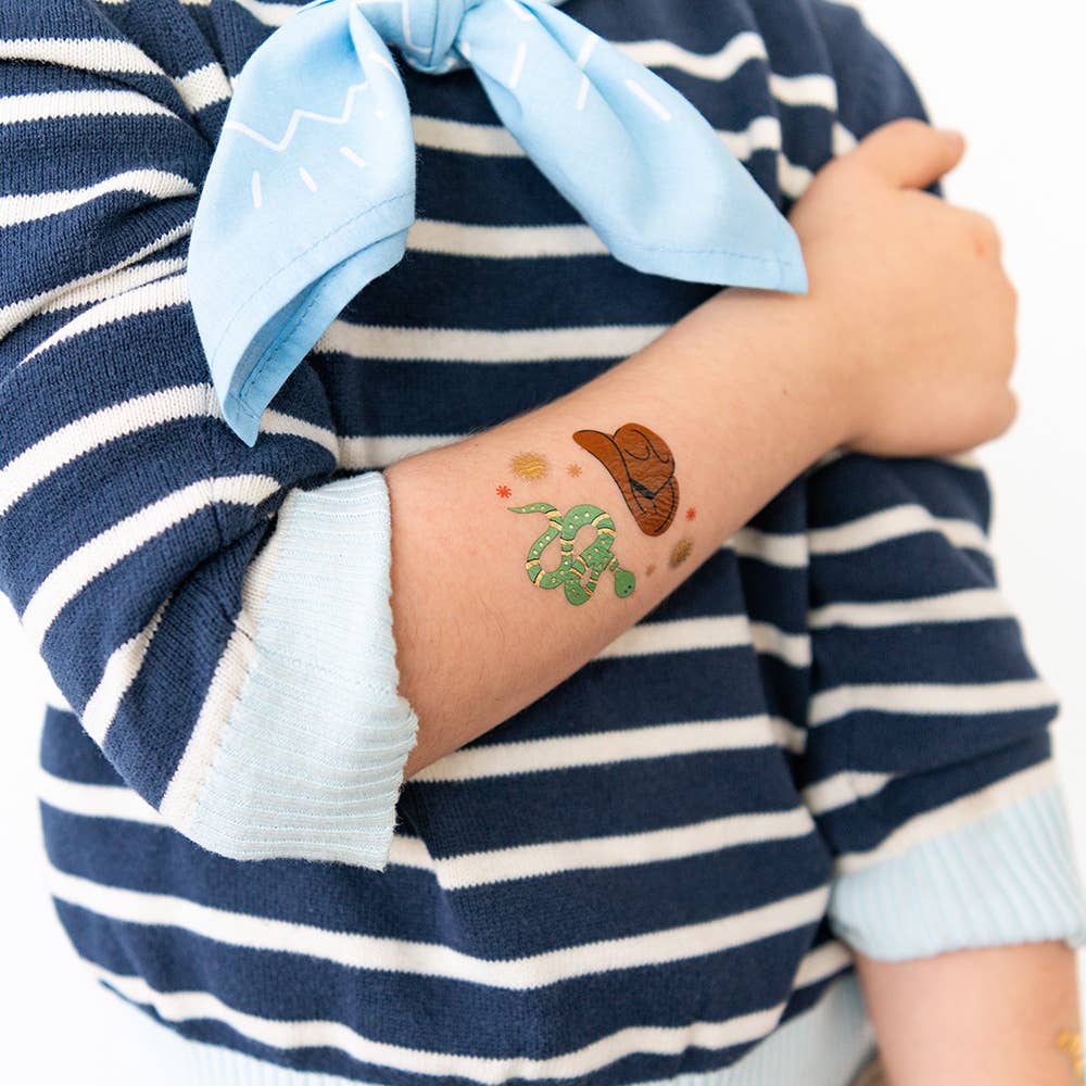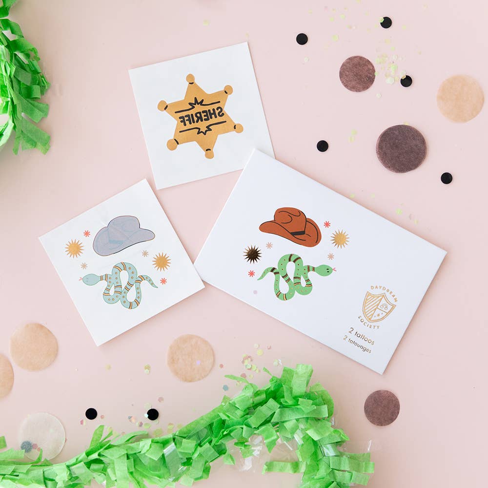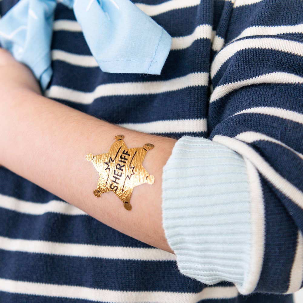 These temporary tattoos feature designs of a cowboy hat, snake, and sheriff badge in shiny gold foil.